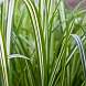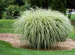 Мискантус китайский Cabaret (Кабаре). Высота до 150 см. Листья широкие, с белой полосой или несколькими довольно широкими полосками. Цветение розоватыми метелками. Очень декоративен. Образует красивую светлую кочку. Листья красиво поникают.