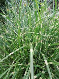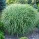 Мискантус китайский Little Zebra (Литли Зебра). Многолетнее плотное кустовое растение высотой всего до 70 см. Листья изящно изогнутые, узкие, желто-зеленые, с золотистыми поперечными полосками.