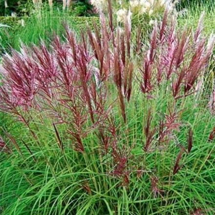 Мискантус китайский Red Chief (Ред Чиф). Декоративный злак высотой до 150 см. Листья узкие, дуговидные, изящные, тёмно-зелёные, блестящие, осенью желтовато-красноватые. Цветки крошечные, вначале тёмно-бордово-красные, затем серебристые. Цветение в августе-сентябре. Зона 5 (до -23°С).