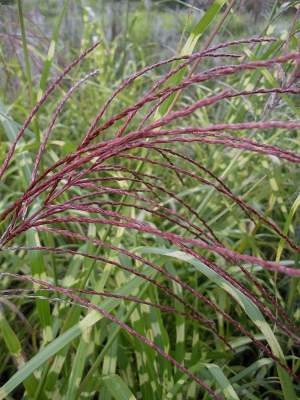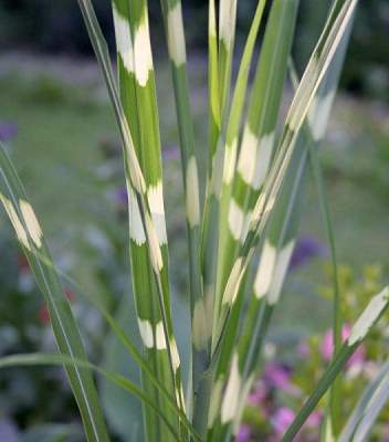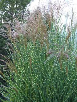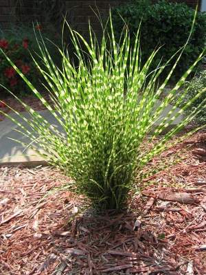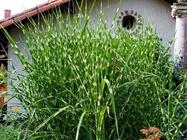 Мискантус китайский Zebrinus (Зебринус). Похож на сорт "Strictus", но более раскидистый. Листья линейные с нерегулярными поперечными кремовыми или бледно-жёлтыми полосами. Цветоносы высотой 175 см. Цветки медные. Цветение в августе-октябре. Требует солнечного места, влажной плодородной почвы и высокой влажности воздуха.