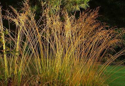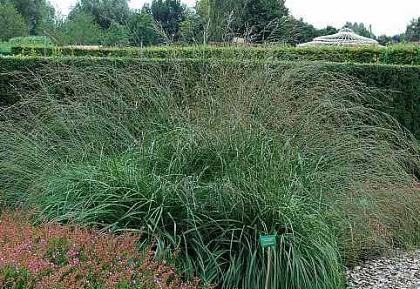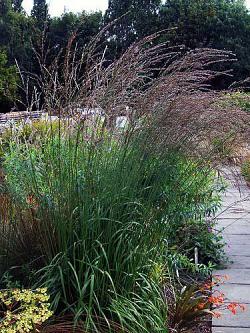 Молиния тростниковая Karl Foerster (Карл Форстер). Прикорневые листья с белой полосой, шириной до 1 см образуют кочку-холм высотой до 70 см. Цветковые стебли поднимаются до 230 см. На концах стеблей широкие метелки коричневого цвета.