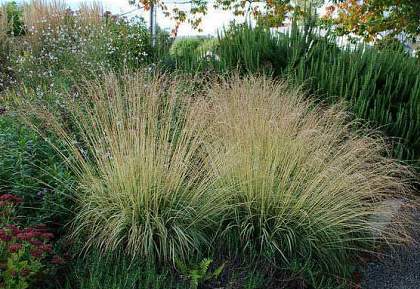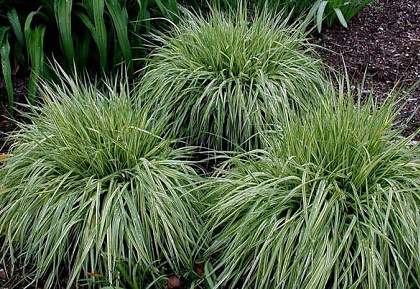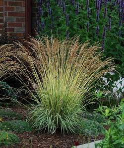 Молиния голубая Variegata (Вариегата). Листья с продольными полосами желтовато-кремового цвета, куст очень широкий, цветоносы изогнуты, соцветия перистые. Оригинальный облик растению придают фиолетовые колоски и лишенные узлов стебли.