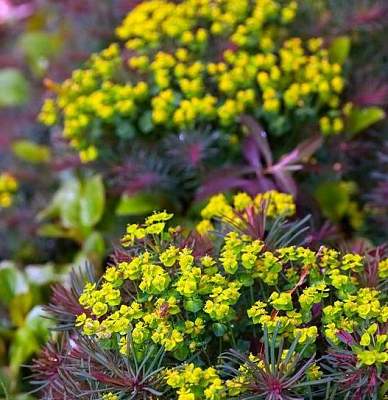 Цветник с молочаем Fens Ruby (Фенс Руби) кипарисовым на переднем плане.