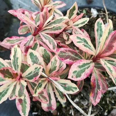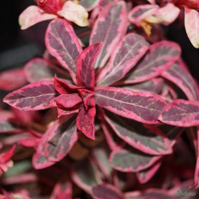 Молочай миндальный Frosted Flame (Фростед Флейм). Цветки шартрезовые с жёлтыми прицветниками. Цветение в мае-июне. Листья летом серо-зелёные с неравномерной кремовой каймой, осенью при понижении температуры появляется красный цвет. Высота 35-40 см. Место солнечное или полутенистое. Почва лёгкая, хорошо дренированная.