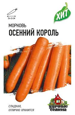 Морковь Осенний король. Среднепоздний (период от всходов до уборки урожая 130-135 дней) высокоурожайный сорт. Розетка листьев полупрямостоячая. Корнеплоды выравненные, конусовидные с тупым кончиком (сортотип Флакке), длиной 20-23 см, массой 120-135 г. Мякоть сочная, оранжевая, сладкая, вкусная. Выращивают прямым посевом в открытый грунт. Рекомендуется для употребления в свежем виде, переработки и хранения. Урожайность 6-7 кг/м2.