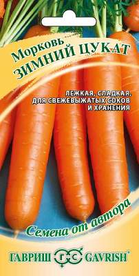 Морковь Зимний цукат. Позднеспелый лежкий сорт сортотипа Берликум с отменным вкусом. Корнеплоды оранжевые, цилиндрические, массой 130-180 г. Мякоть плотная, сладкая, сочная, с высоким содержанием каротина. Сорт рекомендуется для непосредственного употребления в свежем виде, приготовления полезных свежевыжатых соков, замораживания и длительного хранения. Урожайность 3,5 (до 5,0) кг/м2. Посев семян в грунт производится в конце апреля — начале мая на глубину 1 см, расстояние между рядками 18-20 см. Подросшие всходы прореживают, оставляя между растениями по 5-6 см.