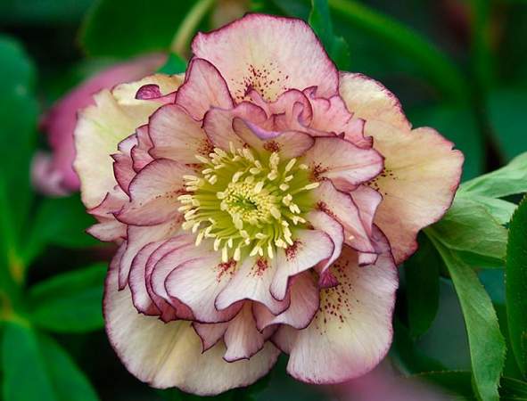 Морозник Double Ellen Picotee (Дабл Элен Пикоти). Крупные махровые цветки кремово-белого цвета с тонкой пурпурной каймой. Высота растения 35 см. Хорошо растет в полутенистых местах. Одно из главных украшений весеннего сада. Цветет невероятно долго.
