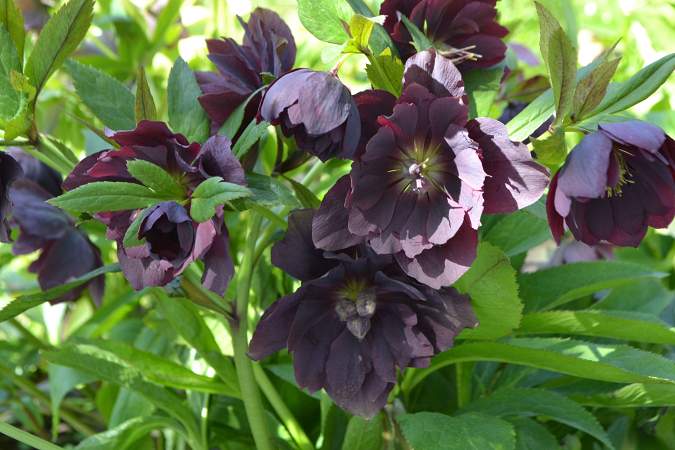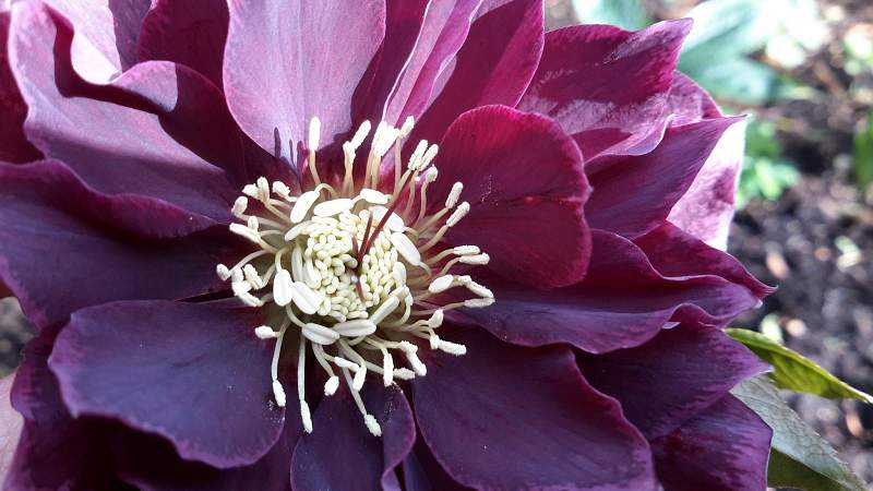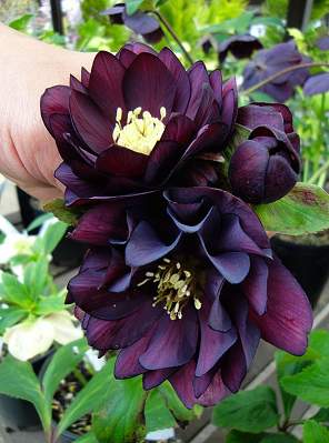 Морозник Double Ellen Purple (Дабл Эллен Пёпл). Цветки очень крупные, махровые. Лепестки слегка волнистые. Окраска темно-пурпурная. Цветки выразительные, многочисленные. Цветет морозник в марте-апреле, весьма продолжительно.