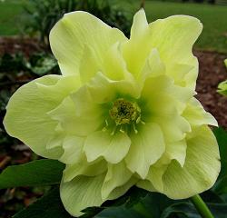 Морозник Golden Discovery (Голден Дискавери). Крупные полумахровые светло-желтые цветки с зеленым оттенком.