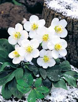 Вечнозеленый многолетник до 30 см высотой. Цветки у него очень крупные, обычно до 8 см в диаметре, снежно-белые, только снаружи с легким розовым оттенком, который с возрастом постепенно усиливается. Что еще ценно: цветок смотрит почти что вверх, а не поникает, как у большинства морозников.