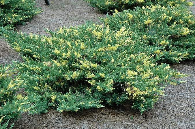 Можжевельник Andorra Variegata (Андорра Вариегата). Карликовый кустарник высотой до 0,4 м в высоту и до 1-1,5 м диаметром. Крона подушковидная. Хвоя зеленая с кремово-белыми хаотичными вкраплениями, зимой буро-коричневая. Светолюбив, но выносит небольшое затенение. Морозостоек. Неприхотлив, быстро разрастается. Очень декоративен.
