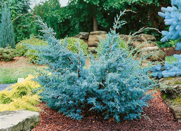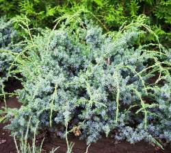 Можжевельник китайский Blue Alps (Блу Алпс). Кустарник с густой компактной кроной. Хвоя игольчатая, длиной до 1 см, серебристо-голубовато-зелёная. Концы побегов свисающие. Светолюбив. Морозостоек. Весной требует защиты от солнца.