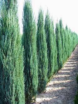 Можжевельник Blue Arrow (Блу Эрроу). Узкая колоновидная крона напоминает стрелу. Жесткие, вертикально растущие, плотно прижатые к стволу побеги, прирастают примерно 15 см в год. В 10-летнем возрасте растение достигает 2-2,5 м в высоту и 0,5-0,7 м в диаметре. Хвоя ярко-голубая, мягкая, чешуйчатая. Плоды — сизовато-синие шишкоягоды.