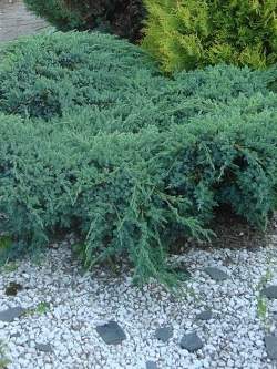 Можжевельник Blue Sparkle (Блю Спаркл). Невысокий, раскидистый, хвойный стелющийся кустарник с приподнятыми побегами. Можжевельник Блю Спаркл достигает высоты 50-100 см и 100-150 см в диаметре. Ежегодный прирост составляет около 20 см. Хвоя зеленовато-голубого цвета, декоративная, имеет форму мелких иголочек. На фоне густой хвои зеленовато-голубого цвета очень эффектно смотрятся округлые серо-голубые шишки, сперва зеленые, потом с сизым восковым налетом, известные как можжевеловые ягоды.