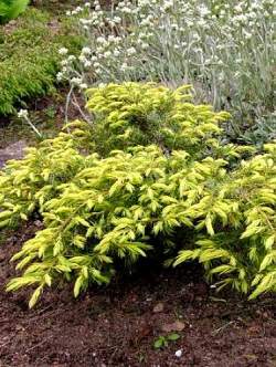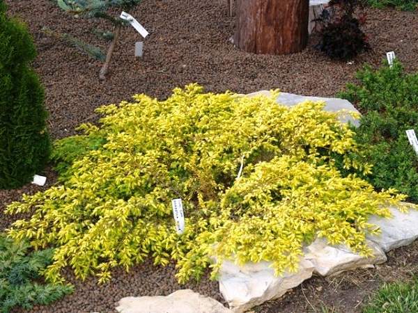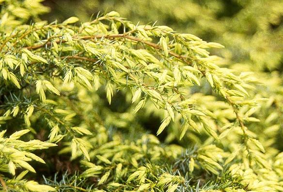 Можжевельник Depressa Aurea (Депресса Ауреа). Красивый почвопокровный кустарник, в высоту не более 30-50 см, в диаметре не превышает 1 м. Годовой прирост составляет 15 см. Крона кустарника раскидистая с декоративными приподнятыми ветвями, формирующими равномерную крону, в середине которой располагается небольшое углубление. Хвоя короткая, золотисто-жёлтого цвета, к зиме она буреет или коричневеет. С годами хвоя становится желто-коричневой.