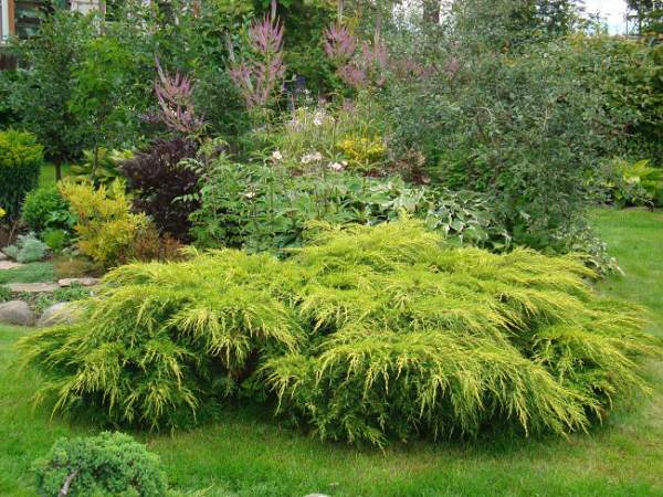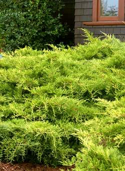 Можжевельник Gold Coast (Голд Кост). Хвойный вечнозеленый быстрорастущий кустарник с плотной золотисто-зеленой раскидистой кроной. Горизонтально расположенные с элегантно опущенными кончиками побеги в период роста имеют особенно яркую желтую окраску. Позже побеги темнеют. Мягкая чешуйчатая хвоя у основания ветвей становится игловидной, колючей.