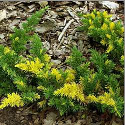 Вариегатная форма с желто-желеной хвоей. Один из самых необычных хвойных кустарников. Невысокий стелющийся кустарник с ползучими и слегка приподнимающимися на концах ветвями. Кора коричневая или красно-коричневая, отслаивающаяся, старые ветви коричнево-серые.