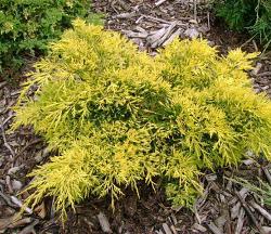 Можжевельник средний King of Spring (Кинг ов Спринг). Крона компактная, с равномерно расположенными ветвями, плотно покрытыми светло-зеленой, а на концах побегах ярко-желтой хвоей. Молодые веточки удлиненные, тонкие, выступают из кроны. Хвоя мягкая, плотная.