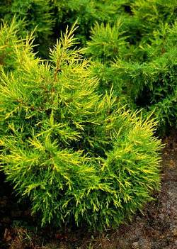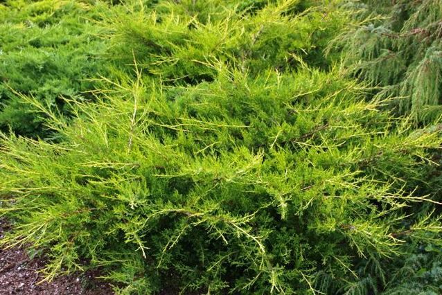 Можжевельник Kuriwao Gold (Куривао Голд). Кустарник с раскидистой кроной. Светолюбив, не требователен к почвам, морозостоек. Молодые побеги ярко-золотистого цвета, что даёт хороший декоративный эффект на фоне тёмно-зелёной старой хвои.