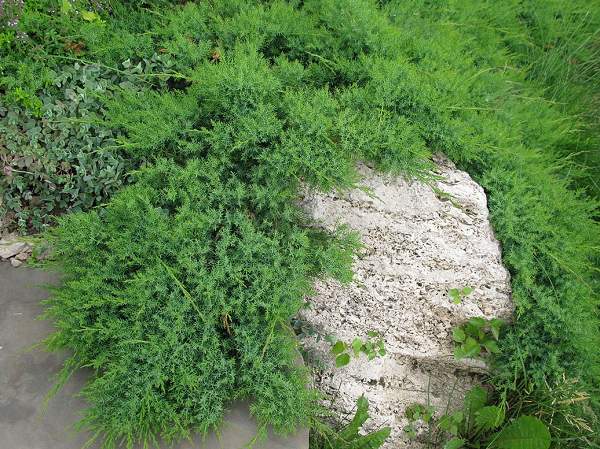 Можжевельник Leningrad (Ленинград). Диаметр кроны 2 м. В молодом возрасте имеет подушковидную форму, затем разрастаясь, становится распростёртым. Молодые побеги светло-коричневые, более зрелые становятся темно-коричневыми.