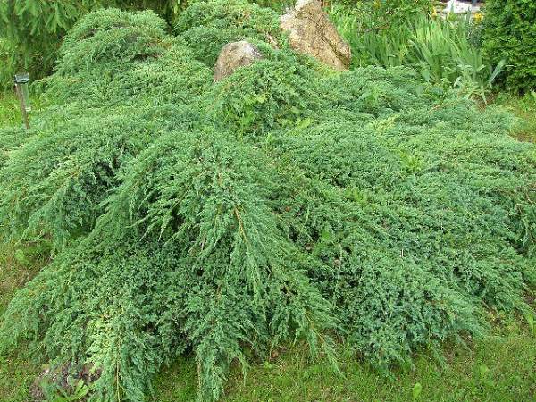 Можжевельник средний Pfitzeriana Compacta (Пфитцериана Компакта). Медленнорастущий хвойный вечнозеленый кустарник, к 10-ти годам достигающий 0,8 м в высоту и 1,5 м в диаметре. Крона плотная, распростертая нерегулярная. Хвоя чешуйчатая, у основания ветвей игольчатая, светло-зеленая. Плоды — сине-сизые мелкие шишкоягоды.