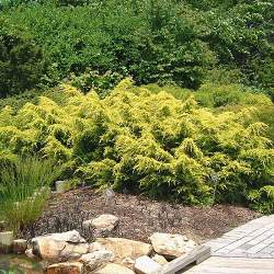 Раскидистый хвойный кустарник, высотой — около 1,5м. при диаметре до 2-3м. Кончики молодых побегов золотистые. Крона изначально распростертая, затем приподнятая, концы побегов слегка свисающие. Неприхотлив, теневынослив, хорошо растет на любой садовой почве. Устойчив к жаре, засухе. Рекомендуется для групповых и одиночных посадок, для живых изгородей и альпийских горок.