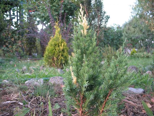 Можжевельник Stricta Variegata (Стрикта Вариегата). Крона неправильной формы, коническая, плотная. Медленно растущая форма, в возрасте 10 лет достигает 2 м в высоту. Побеги жесткие, короткие. Хвоя колючая, сине-зеленая, характерной чертой являются веточки с бело-пестрой окраской. Требования к почве и влаге невысокие. Рекомендуется для приусадебных и вересковых садов.