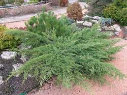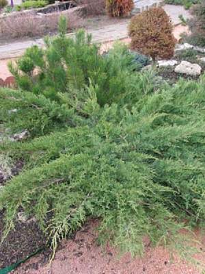 Раскидистый густой медленно растущий кустарник. Побеги стелются по земле, позже приподнимаются. Хвоя мелкая, серо-зеленая с сизым налетом. Годовой прирост 7-10 см. К почвам неприхотлив. Предпочитает солнце или небольшое затенение. Обладает высокой зимостойкостью. Используется в групповых и одиночных посадках, для создания ландшафтных композиций.
