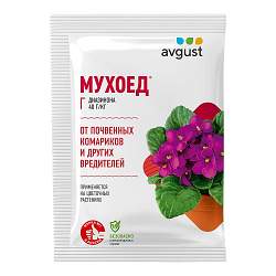 Мухоед. Высокоэффективное средство для борьбы с почвенными вредителями на овощных культурах и комнатных растениях. Уничтожает личинки и взрослых насекомых. Гибель вредителей наступает в течение первых двух суток после обработки. Быстро разлагается и не накапливается в почве.