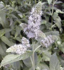 Цветки лиловые, собраны в сближенные мутовки, образующие густые колосовидные соцветия; распускаются в июле-августе. Плодоносит в августе-сентябре. Аромат классический мятный.