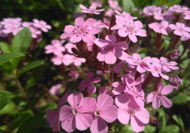 Мыльнянка базиликолистная Вдохновение. Неприхотливое многолетнее растение. Побеги длинные, частично восходящие, частично полегающие. Для хорошего ветвления их нужно весной прищипывать. Цветение обильное в июне. Цветки пудрово-розовые. После цветения необходима обрезка. Хороша на подпорных стенках.