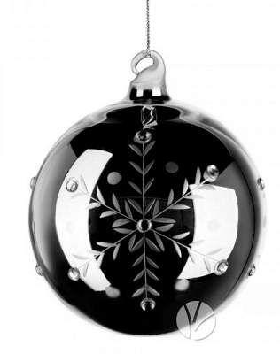 Красивый черный лаковый шар прекрасно дополнит праздничный интерьер. Элегантность шара подчеркивает серебристый рисунок.
