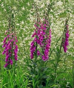 Наперстянка Dalmatian Purple (Далмэйшн Пёпл). Цветки пурпурные с лиловым оттенком. Идеальными условиями для получения прекрасного результата при выращивании наперстянки, являются полутень или разреженный свет. Богатый гумусом влажный грунт с кисловатой реакцией желателен. После окончания цветения цветонос обрезают у земли.