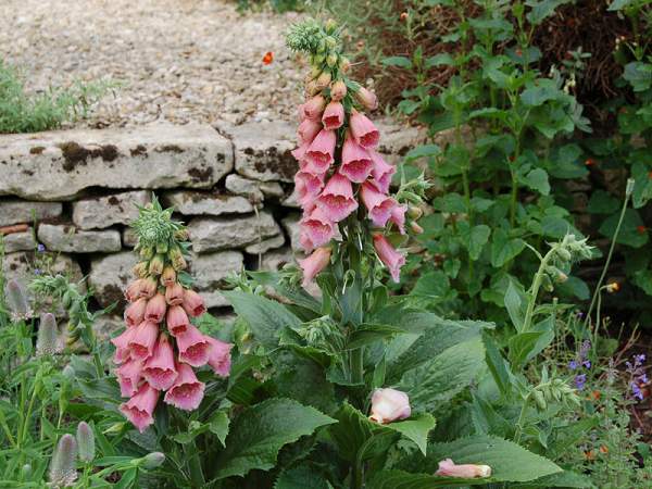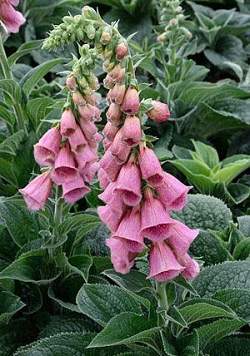 Наперстянка Мертона. Является гибридом наперстянки крупноцветковой, от которой она унаследовала блестящие вечнозеленые листья, и наперстянки пурпурной, от которой ей достались появляющиеся в конце весны пятнистые цветки.