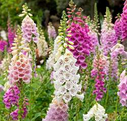 Наперстянка Жемчужина. Цветки крупные, 5-7 см, собраны в пирамидальные соцветия. Высота растения до 130 см. Используется на средних или задних рядах смешанных цветников, в посадках у стен и под деревьями, отлично подходит для срезки. Без наперстянок не обходится ни один классический миксбордер. Наперстянки ядовиты, поэтому следует соблюдать осторожность, особенно если у вас маленькие дети.