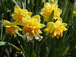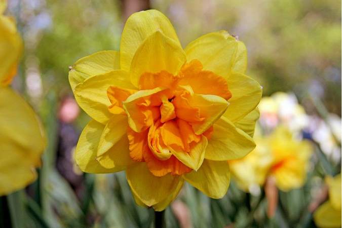 Нарцисс Apotheose (Апофеоз). Цветок жёлтый с ярко-оранжевым центром, махровый. Высота растения 40 см.