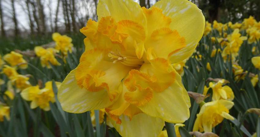 Нарцисс Blazing Starlet (Блейзинг Старлет). Лимонно-желтый с кремово-желтой коронкой и эффектной гофрированной оранжевой каймой, устойчив к ветру и дождю, высота растения 40 см.