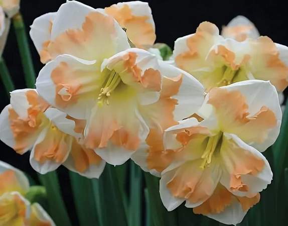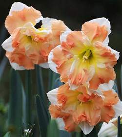Нарцисс Cum Laude (Кум Лауде). Цветок белый с нежно-розовой гофрированной коронкой, ярко-оранжевой по краю. Высота растения 40 см.