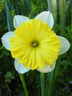 Нарцисс Dinnerplate (Диннерплейт). Высота растения 40 см. Цветок яркий, крупный, белый с желтой коронкой.