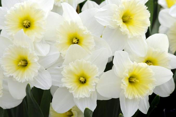 Нарцисс Ice Follies (Айс Фоллис). Белый, лимонно-желтая коронка быстро светлеет в период цветения. Цветонос прочный. Чашевидная гофрированная коронка. Устойчив к болезням, отличается высоким коэффициентом размножения. Множество наград: AGM 1993; Wister Award 1992; FCC(g) 1978; FCC(p) 1975. Раннее цветение.