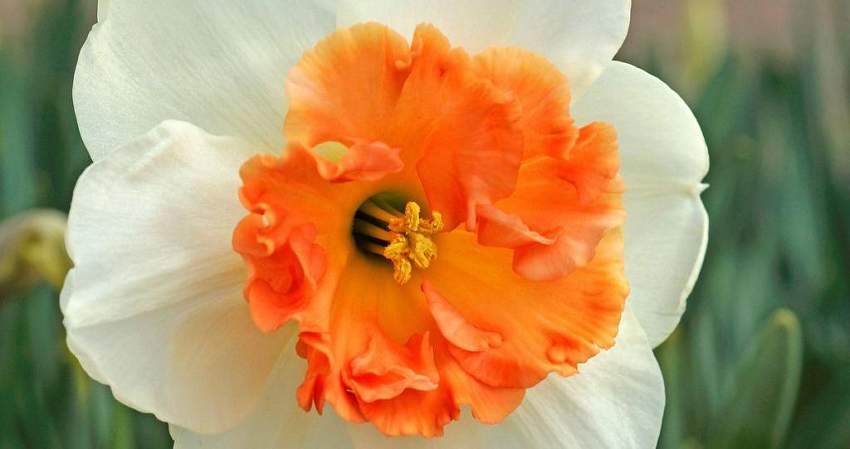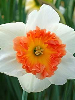 Нарцисс Precocious (Прикоушес). Высота растения 40 см, цветок белый с красно-оранжевой гофрированной коронкой.
