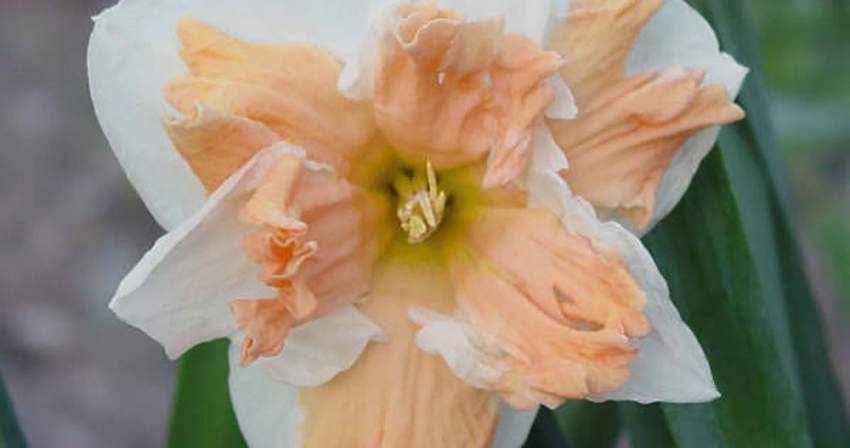 Нарцисс Rainbow of Colours (Рейнбоу ов Колорз). Высота растения 45 см, цветок очень красивый, нежно-кремовый с крупной гофрированной коронкой, которая меняет цвет от желто-оранжевого до лососево-розового, ароматный.