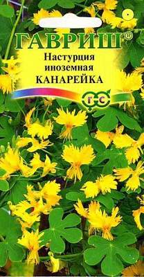Настурция Канарейка (иноземная). Однолетнее травянистое, вьющееся растение. Стебли до 350 см длиной, светло-зеленые. Листья небольшие, пяти-семираздельные. Цветки мелкие, канареечно-желтые с гофрированными лепестками и зелеными шпорцами. Цветет с июля до заморозков. Растение теплолюбивое и светолюбивое. Предпочитает влажные, умеренно плодородные почвогрунты. Семена высевают в мае непосредственно на постоянное место в лунки по три семени. Шубина заделки семян 2 см. При температуре почвы +18 °C всходы появляются на 20-25 день. Для более раннего цветения можно выращивать рассаду. Высевают в середине апреля в 9 см горшки по 3 штуки. Всходы появляются через две недели. Рассаду высаживают только с земляным комом в конце мая. Великолепное украшение для беседок и шпалер.