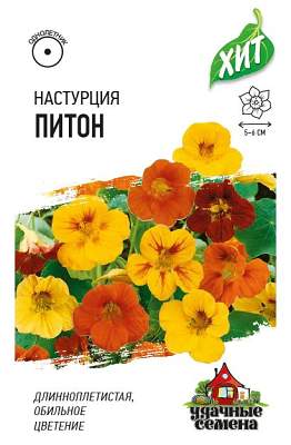 Настурция Питон (длинноплетистая) смесь. Однолетнее травянистое растение семейства Настурциевые с плетистыми побегами длиной до 3,5 м. Цветет обильно с июня до заморозков. Цветки простые 5-6 см в диаметре, разнообразной окраски. Теплолюбива и светолюбива. Предпочитает умеренно плодородные, влажные почвы. Выращивают рассадным способом или прямым посевом в открытый грунт, предварительно намоченными в течение суток семенами, по 3-4 шт. в лунку. При благоприятных условиях настурция завязывает много семян, которые, осыпаясь, способны перезимовать в почве. Используется для вертикального озеленения, как почвопокровное и как ампельное растение.