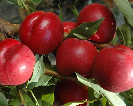 Нектарин карликовый Рубис. Раннего срока созревания. Компактное дерево высотой 1,5 м, очень декоративное. Цветки крупные, розовые, с загнутыми лепестками, раскрываются до появления листочков, ароматные. Плоды круглые, весом до 250 грамм, оранжевые с густым бордово-фиолетовым румянцем. Кожица гладкая, без опушения. Золотистая мякоть сочная, нежная, на вкус сладкая, очень ароматная. Косточка легко отходит от мякоти. Дозревают плоды в конце июля. Устойчив к болезням. Самоплодный.