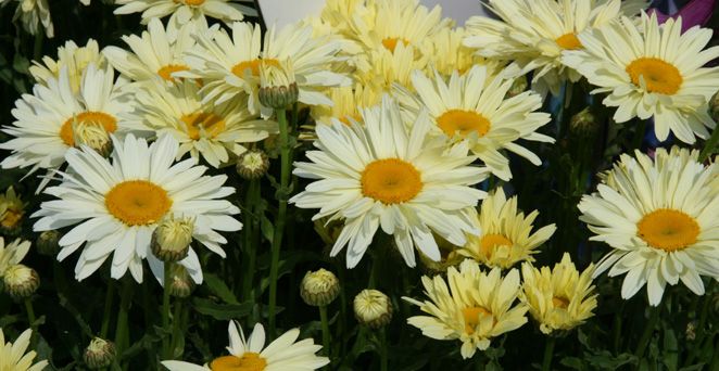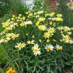 Нивяник Broadway Lights (Бродвей Лайтс). Цветы-хамелеоны диаметром до 12 см, распускаются лимонными, затем выцветают до бледно-желтого. Куст высотой до 60 см. Цветение в июле-августе. Предпочитает солнце или легкую полутень и плодородные почвы.