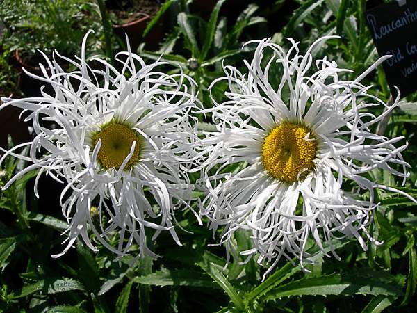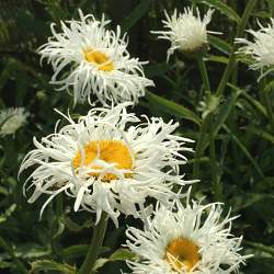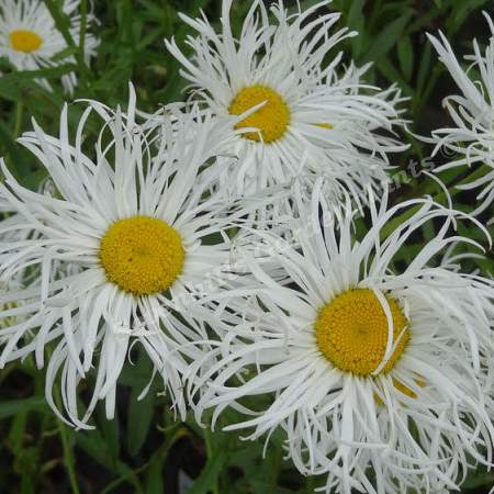 Нивяник Old Court Variety (Олд Корт Вэраети). Цветки необычной формы, белые с массой очень узких завивающихся лепестков вокруг маленького жёлтого центра. В кусте очень много цветоносных стеблей.