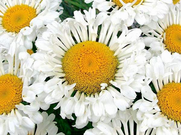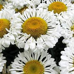 Нивяник Real Neat (Риал Нит). Цветки очень изящные и аккуратные. Белые ложковидные лепестки расположены горизонтально в два-три ряда и окружают жёлтый центр. Листья тёмно-зелёные. Стебли сильные. Высота 35-40 см.