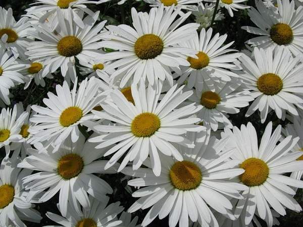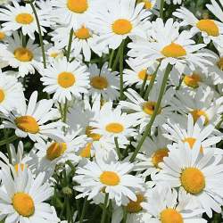 Нивяник Silver Princess (Силвер Принцесс). Компактный сорт, высотой 40 см. Листья темно-зеленые, блестящие. Цветы белые, простые, с желтым центром, до 6 см в диаметре.