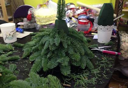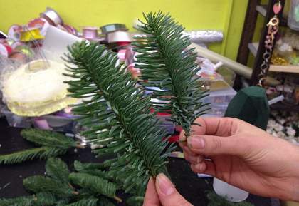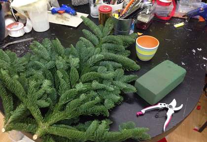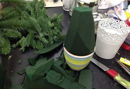 Подготовьте ветки, большие и маленькие, нижнюю часть зачистите от иголок. Старайтесь не втыкать ветки многократно, иначе они начнут вываливаться.